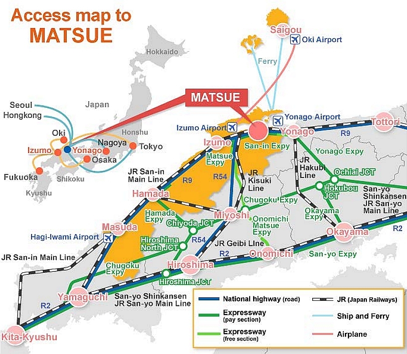 Matsue City is located in southwest Japan, in the north of Shimane Prefecture. Shimane is part of the Chugoku Region, along with four other prefectures (Tottori, Okayama, Hiroshima, and Yamaguchi). The Chugoku Region is commonly subdivided into the San-yo Region (south side) along the Seto Inland Sea coast, and the San-in Region (north side) along the Sea of Japan coast, of which Matsue is the largest city.